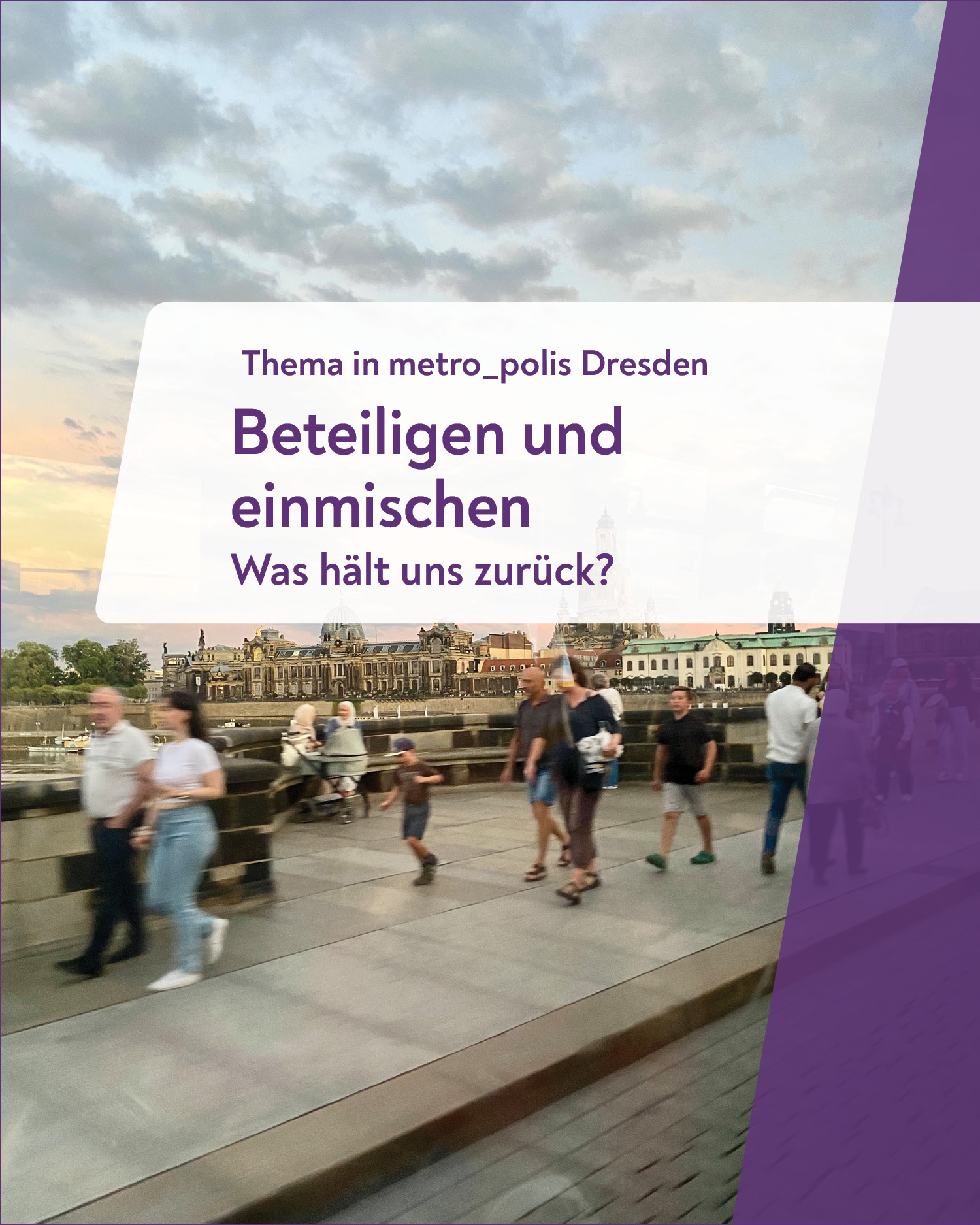 metro_polis steht für Beteiligung im Alltag. Umso passender, dass das Sächsische Staatsministerium für Soziales, Gesundheit und Gesellschaftlichen Zusammenhalt uns genau dazu im August/September 2025 in die Bahn setzt, um herauszufinden, was Fahrgäste unter „Beteiligung“ eigentlich verstehen, welche Formate sie kennen und wann sie sich das letzte Mal beteiligt haben. Noch wichtiger: Was hält Menschen davon ab, sich in die bestehenden Formate und Möglichkeiten einzubringen?